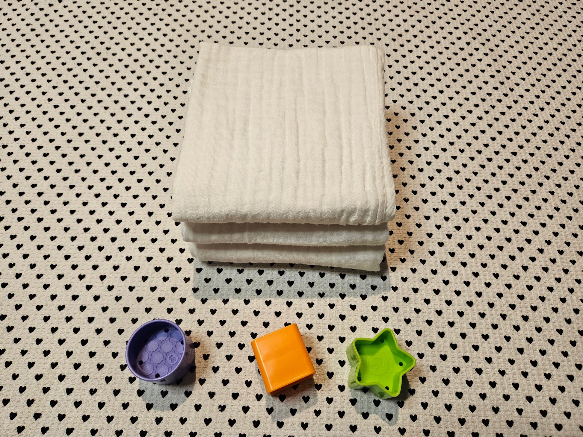 3er-Pack Mulltücher von Joofoss, aus Baumwoll-Musselin-Stoff, extraweich, einwandfrei, gewaschen und gebügelt. Abgerundete Kanten. Eignen sich (im Sommer) auch gut als dünne Babydecke, oder als Wickelunterlage.