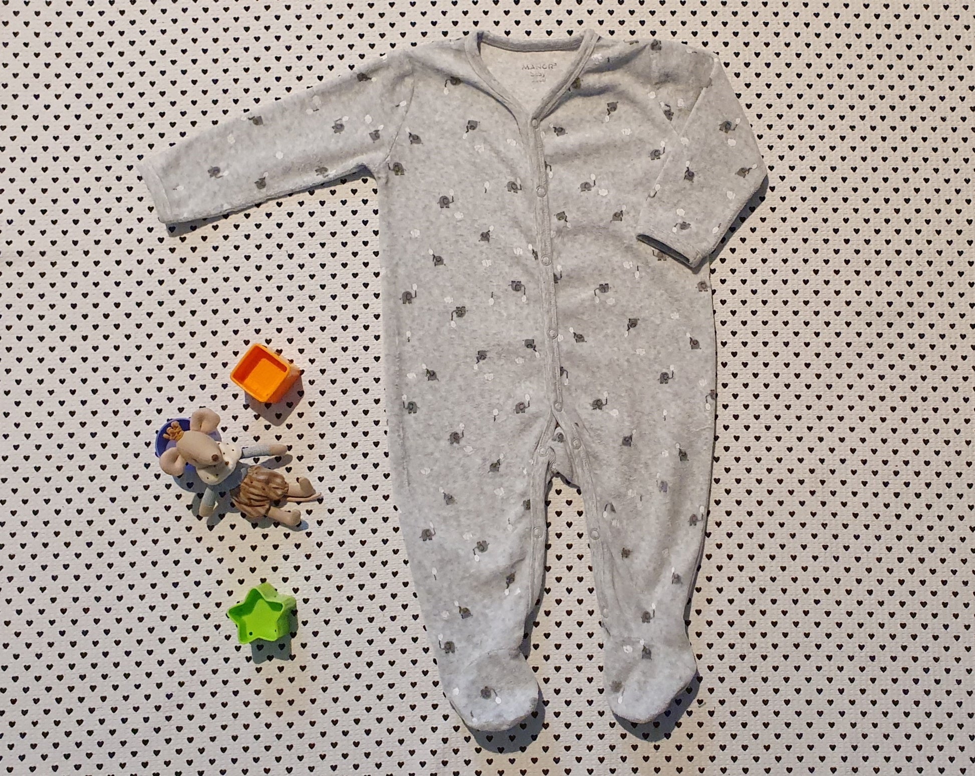 Einteiler/Strampler von Manor mit Elefanten-Motiv, aus Nicky-Stoff, mit Füsschen, mit durchgehender Knopfleiste, auch zwischen den Beinen; für müheloses Windelwechseln