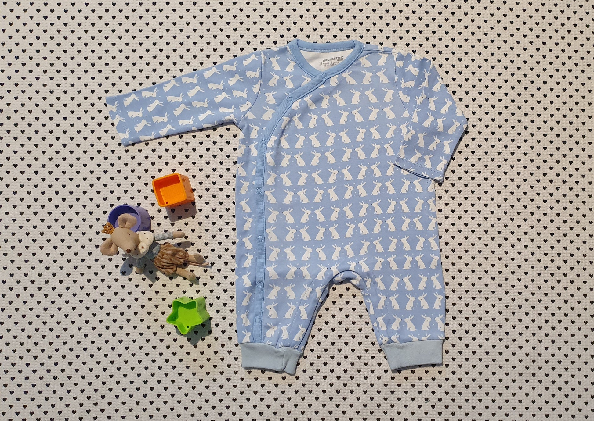 Einteiler/Strampler von Orchestra mit Hasen-Motiv, ohne Füsschen, mit durchgehender Knopfleiste, auch zwischen den Beinen; für müheloses Windelwechseln