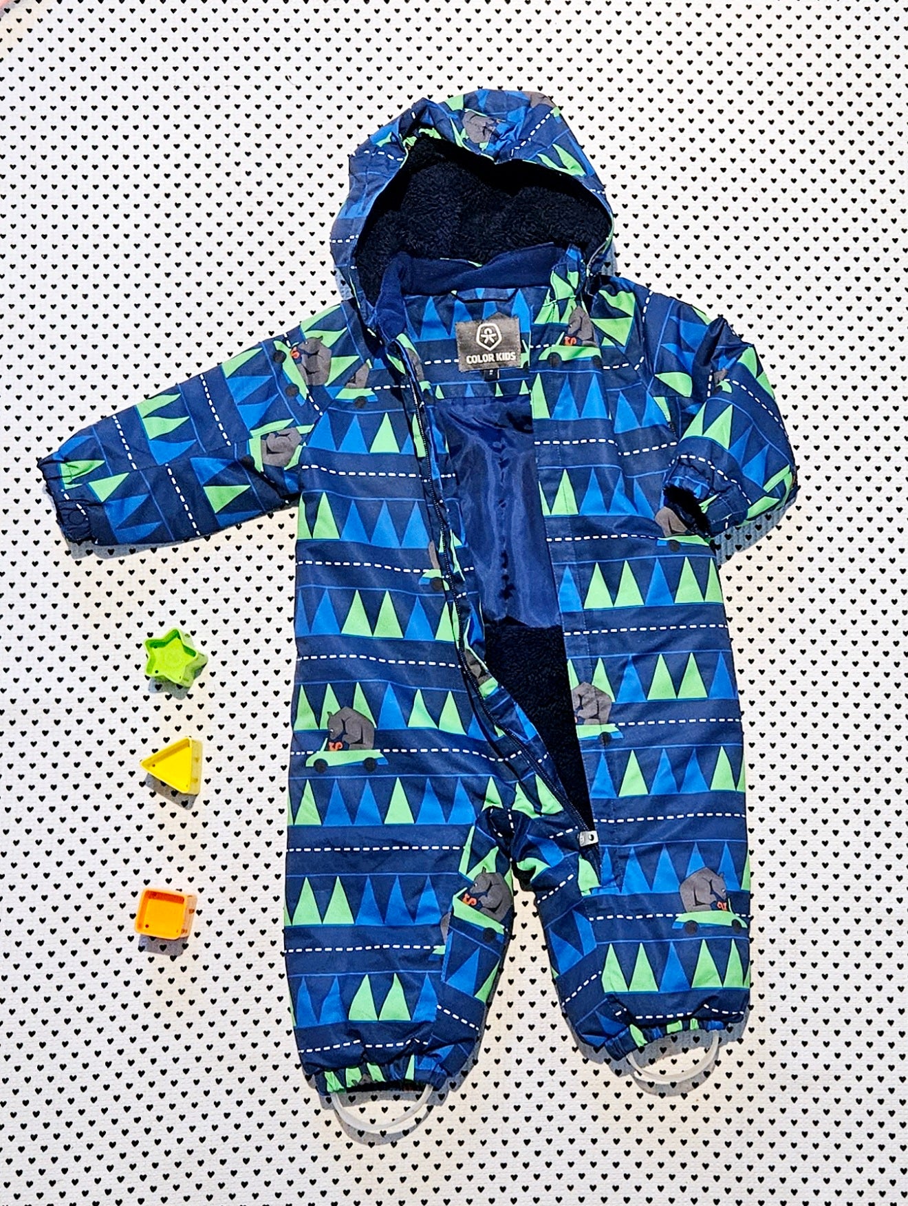 Schneeanzug von Color Kids, mit abnehmbarer Kapuze, Gesässbereich und Kapuze mit warmem Fleece gefüttert, Bär und Eichhörnchen-Motiv, mit robusten Beinschlaufen, Farbe: blau/grün/weiss