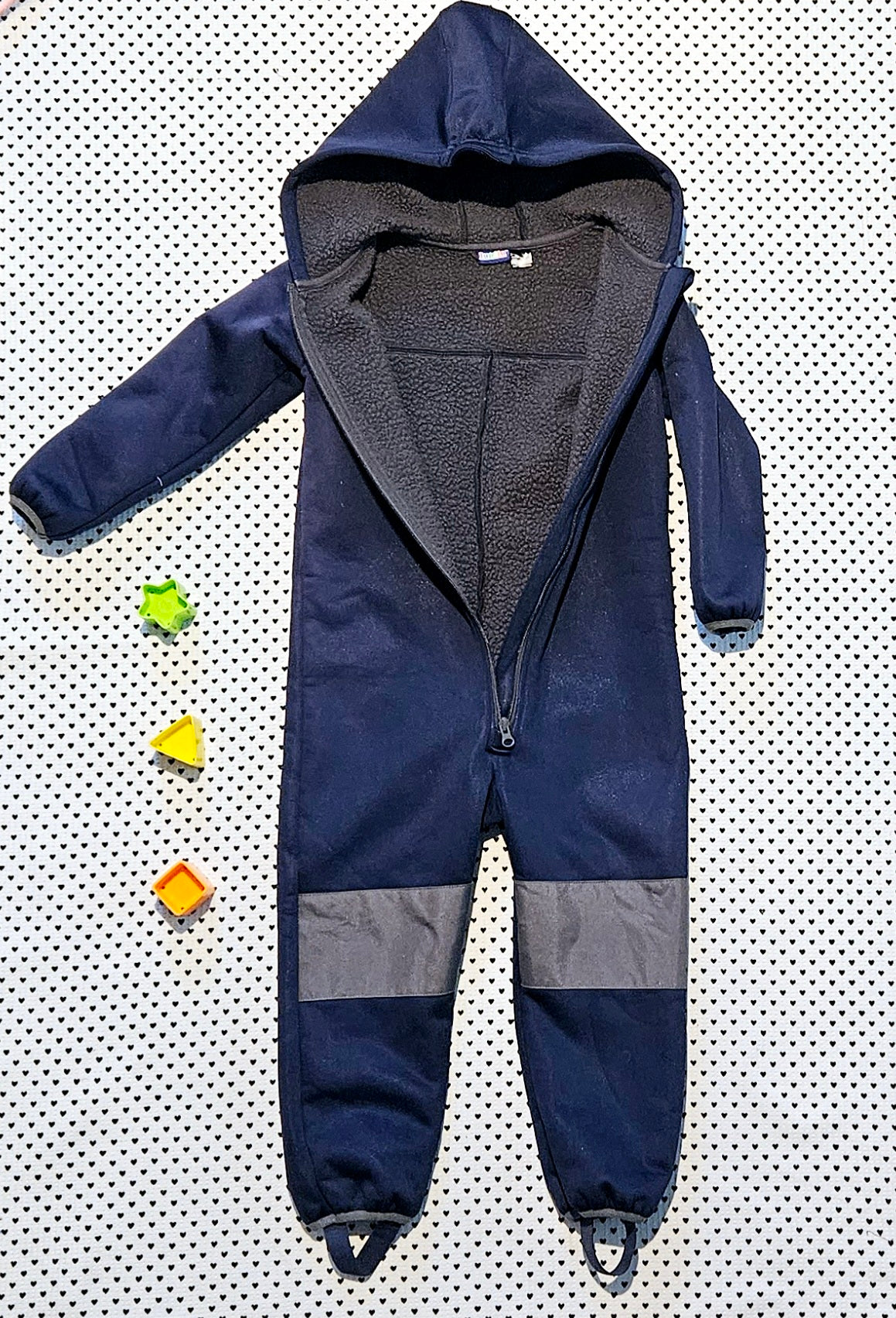 Softshellanzug mit Kapuze von Lupilu, innen komplett mit warmem Fleece gefüttert, verstärkter Kniepartie, Reflektoren und Fuss-Schlaufen, Farbe: dunkelblau, innen: dunkelgrau