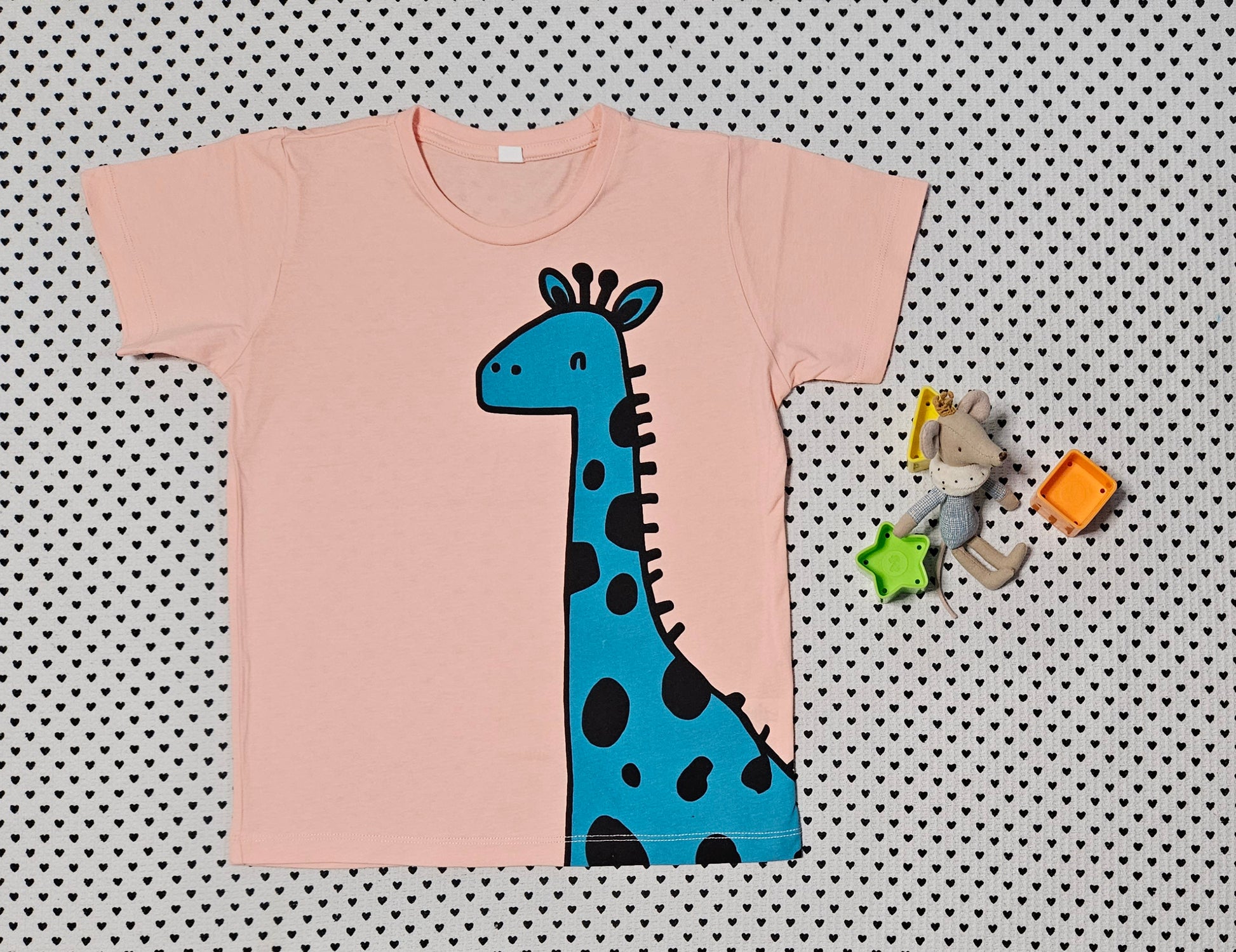 T-Shirt ohne Markenetikette, Rundhals, mit Giraffen-Motiv, Farbe: rosa/petrol