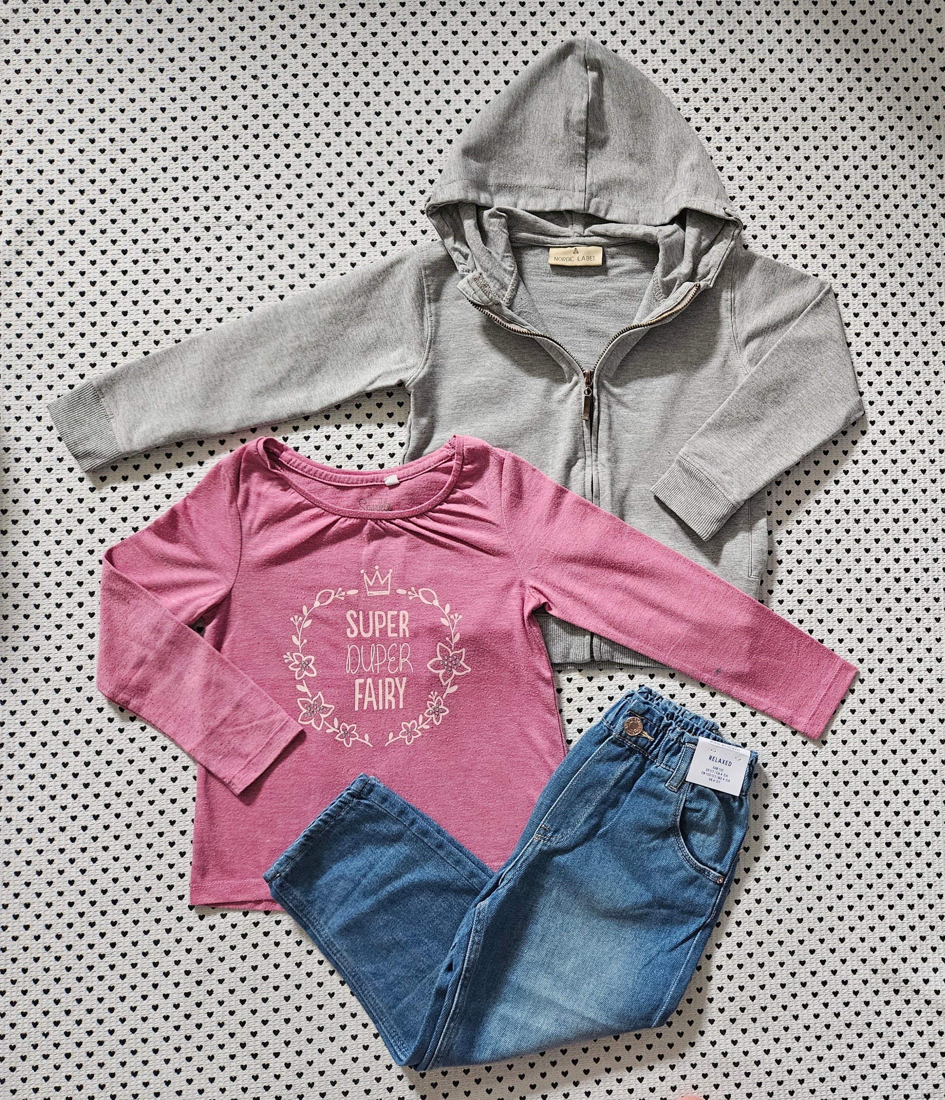 Kids | Mädchen | Set: Langarmshirt, Kapuzenjacke und Paperbag-Jeanshose, Gr. 110