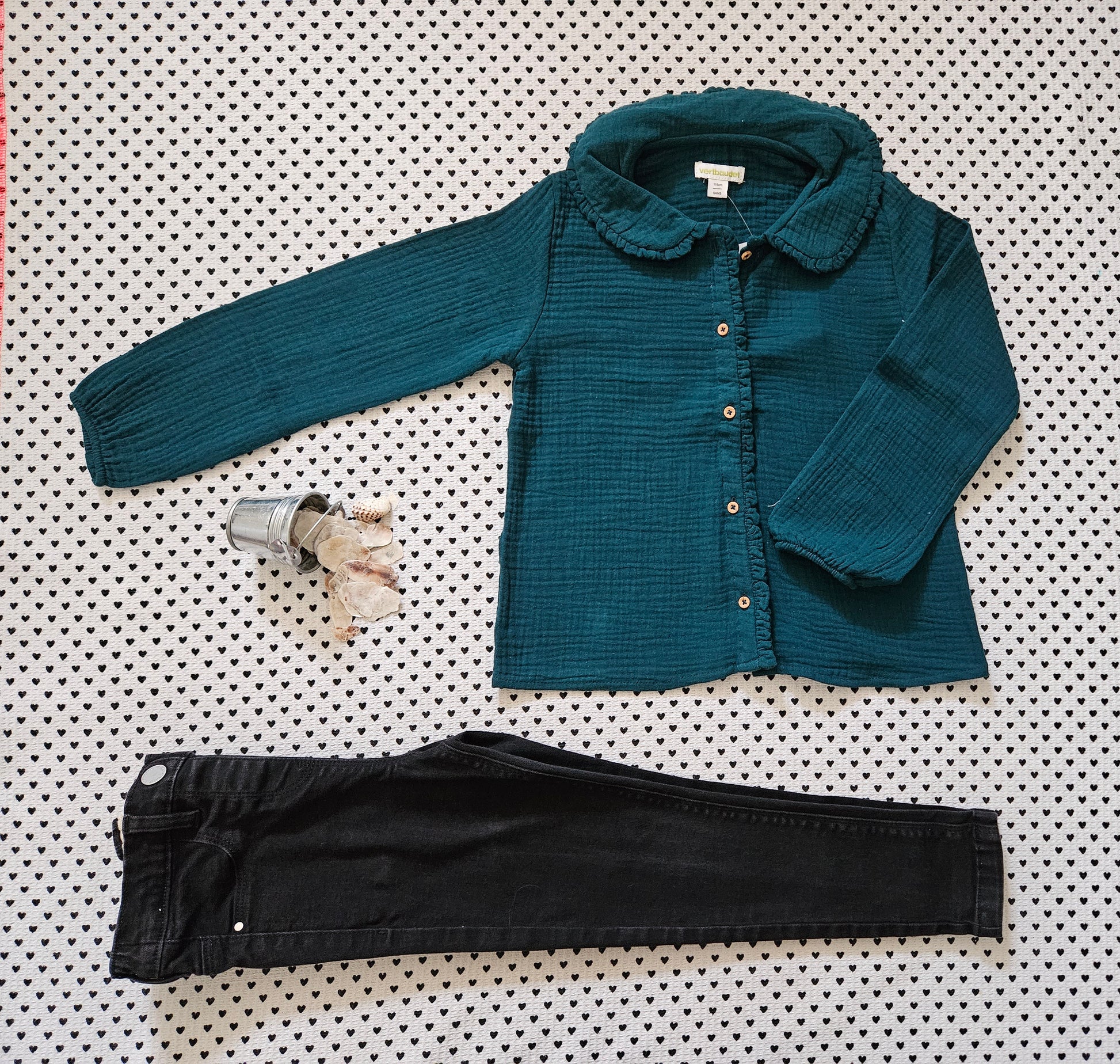 - Bluse mit Bubi-Kragen von Vertbaudet, neu mit Etikette, aus Musselin-Stoff, durchgehender Knopfleiste mit Rüschen, neu noch mit Etikette, Farbe: uni petrol