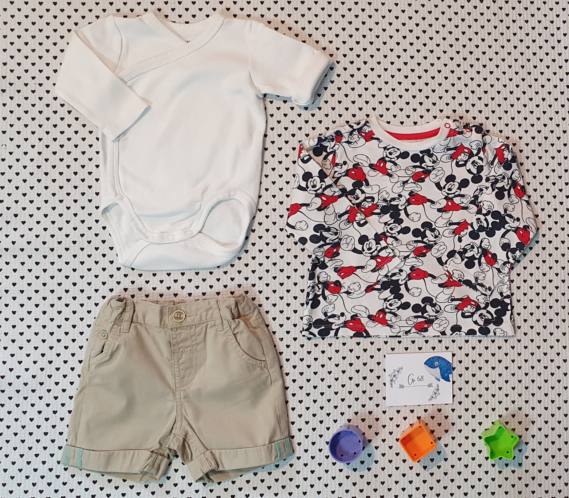 Set: Shirt von Disney Baby mit seitlichen Druckknöpfen neben dem Halsausschnitt, Wickelbody von H&M und Shorts von Baby Club