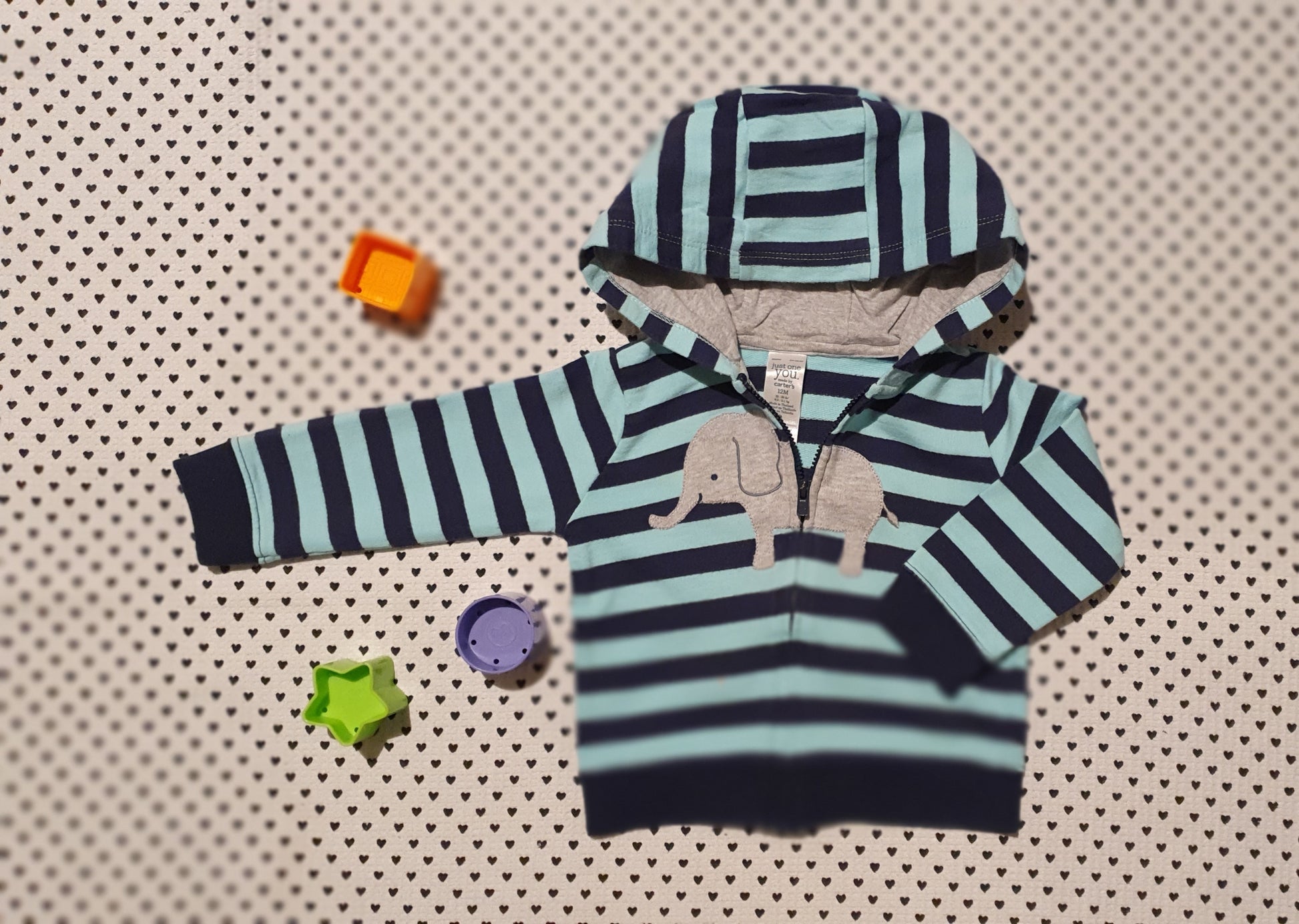 Jäckchen mit Kapuze, durchgehender Reissverschluss, gestreift, Elefanten Motiv