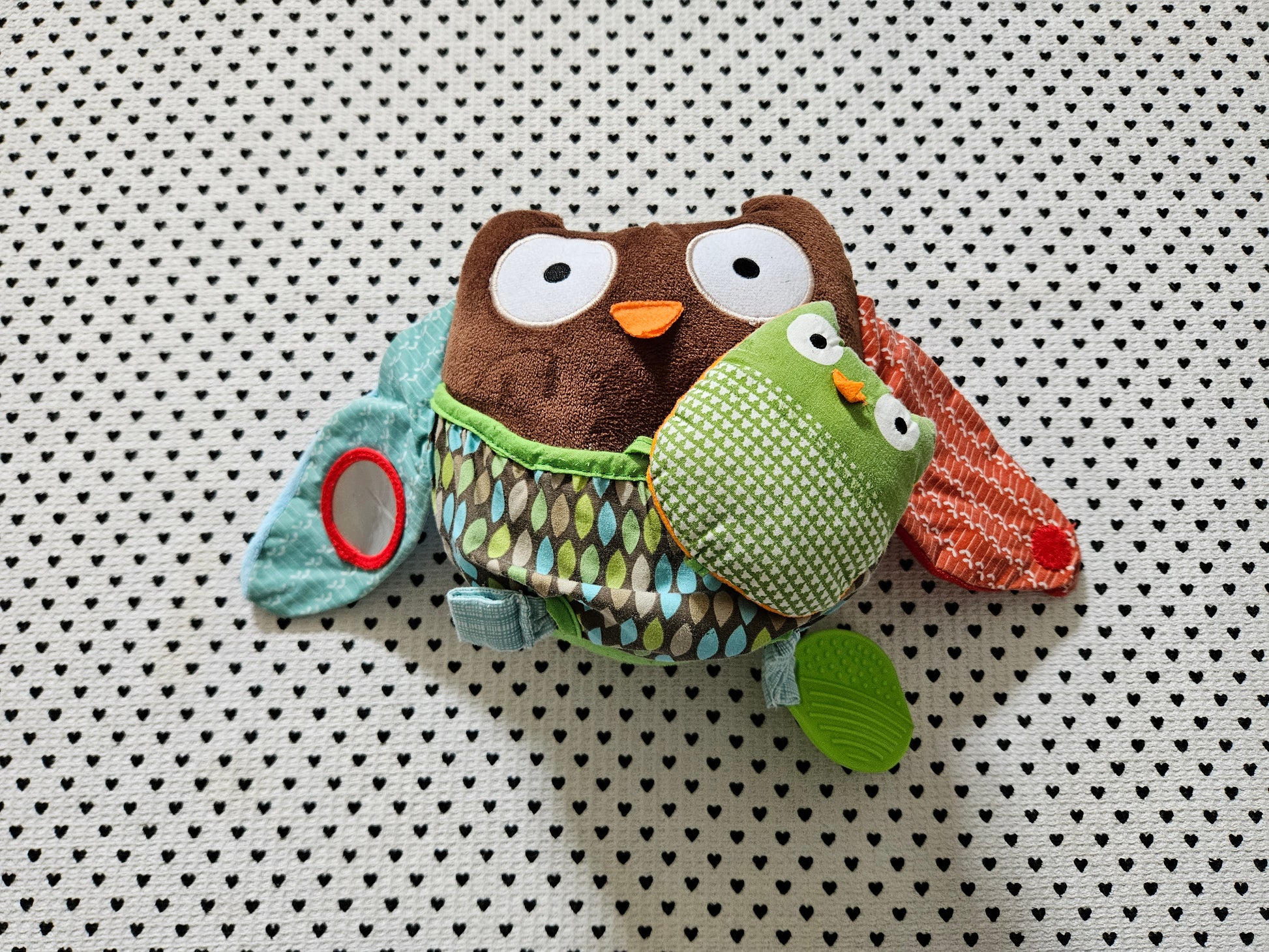 Stofftier Eule mit Junges, fördert den Tast- den Gehörsinn, tolle Farben, sehr schön klingende Glöckchen, mit Beissring, mit Klett verschliessbare Flügel.