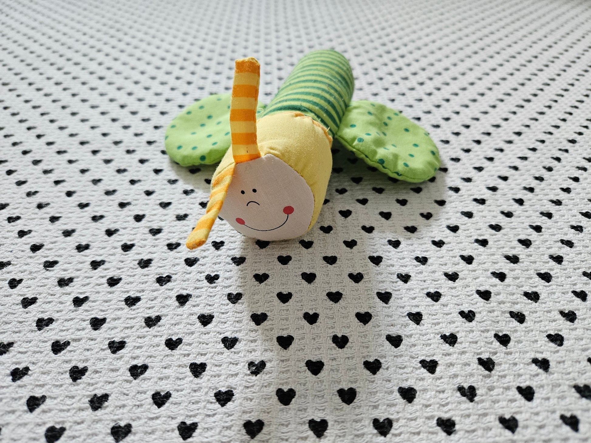 Stoff-Raupe mit Glöckchen und Knister-Flügeln, ideal für kleine Kinderhände.