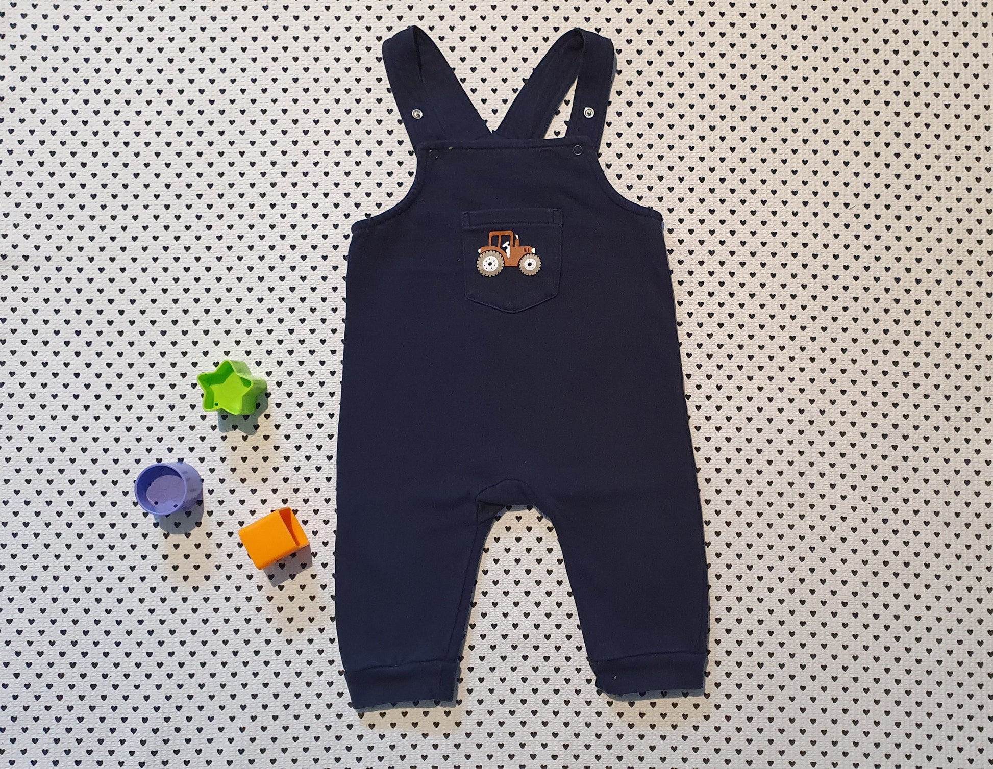 Weiche Latzhose mit langem Bein und Trägern mit verstellbarer Knöpfung, mit Tasche vorne, Traktor Motiv
