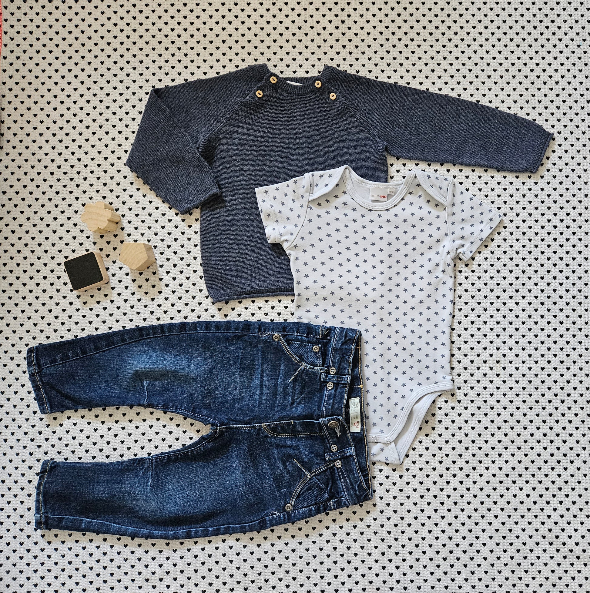 Minis Junge | Set: Body kurzarm, Strickpullover und Jeanshose, Gr. 80/86