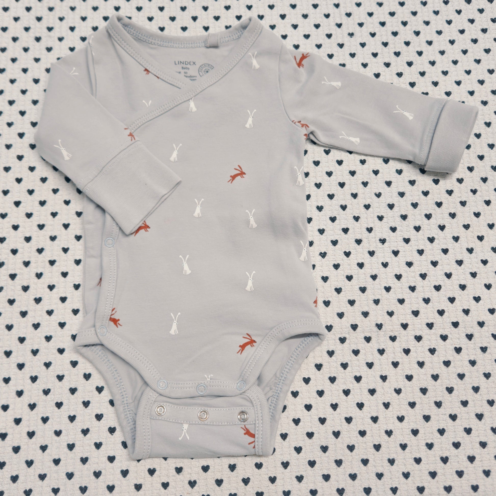 Wickelbody von Lindex, durchgehende Druckknopfleiste, mitwachsende Druckknöpfe zwischen den Beinen, Hasen-Print