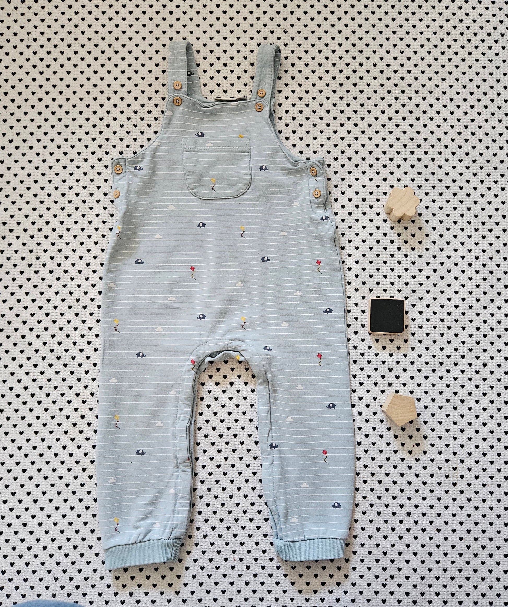 Einteiler/Strampler von Name it, sehr weiches und elastisches Material, hellblau/weiss gestreift, verstellbaren Trägern, Brusttasche und Druckknöpfen zwischen den Beinen; für ein müheloses Windelwechseln.