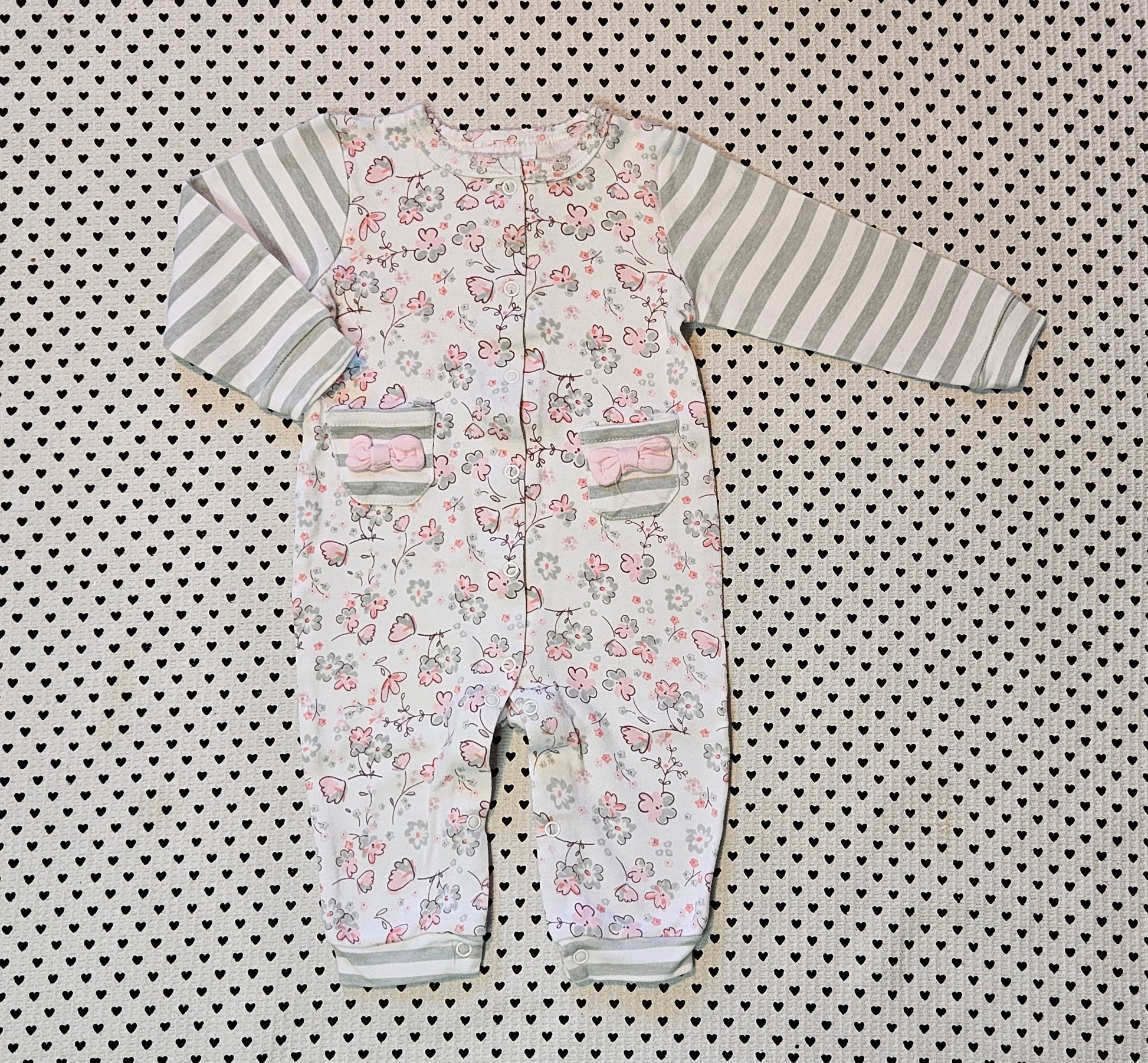 Pyjama von Laura Ashley, mit Blumenmuster und gestreiften Ärmeln, durchgehende Knopfleiste, Taschen vorne mit Schleifen, Druckknöpfe zwischen den Beinen (für müheloses Windelwechseln)